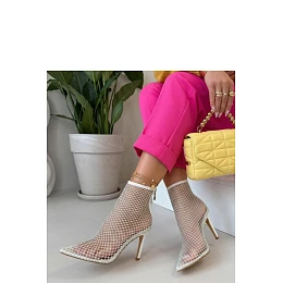 Elegantní síťové botky jsou nabídkou pro ženy, které rády přitahují pohledy a zdůrazňují svůj jedinečný styl. Vyrobené z lehkého nylonu, okouzlují moderním designem a prodyšnou, ažurovou strukturou. Model s elegantním špičatým nánožkem zjemňuje nohu a dodává celku rafinovaný charakter. Štíhlý podpatek výšky 8,5 cm krásně zdůrazňuje postavu, přidává ženskost a sebevědomí. Zapínání na zip umístěné vzadu, na patě, usnadňuje obouvání a zajišťuje pohodlné přizpůsobení. Vložka z umělé hmoty zaručuje pohodlí při nošení a ozdobné cirkóny dodávají botkám výjimečný lesk a eleganci. Vysoký svršek zajišťuje, že model skvěle vypadá na noze, tvoří ideální doplněk jak k večerním, tak odvážným, módním stylizacím.
