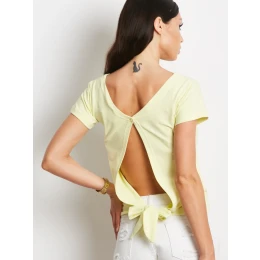 Žluté tričko s výřezem a zavazováním na zádech.