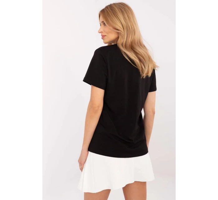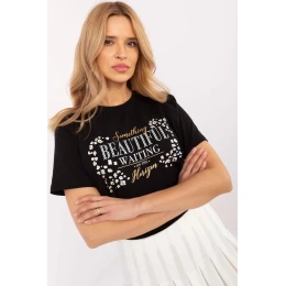 Elegantné dámske tričko s ležérnym charakterom, ideálne na každý deň. Vyrobené z mäkkej bavlny s prídavkom elastanu, poskytuje pohodlie a skvele sedí. Model štandardnej dĺžky s krátkymi rukávmi a klasickým okrúhlym výstrihom. Prednú stranu zdobí nášivka s nápisom, obohatená o ozdobné dýzy, ktoré dodávajú tričku módny a efektný vzhľad. Perfektne sa kombinuje s džínsami, šortkami alebo sukňou, čím vytvára voľnú, ale štýlovú kombináciu.