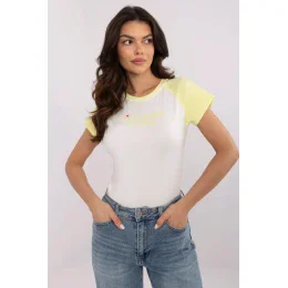 Toto dámske tričko v ležérnom štýle v sebe spája pohodlie a módny dizajn. Je vyrobené z mäkkej rebrovanej bavlny s prídavkom elastanu, vďaka čomu poskytuje pohodlné nosenie a skvele prilieha k postave. Klasický okrúhly výstrih a krátke rukávy sú vyrobené z kontrastného materiálu, ktorý dodáva tričku jedinečný charakter. Na prednej strane sa nachádza štýlová potlač s nápismi, ktorá podčiarkuje moderný a uvoľnený štýl. Vďaka štandardnej dĺžke je skvelým doplnkom k džínsom aj sukniam a vytvára univerzálny základ pre každodenné oblečenie.