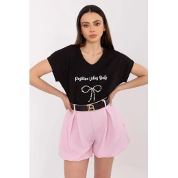 Bezstarostné dámske tričko navrhnuté s ohľadom na každodenné pohodlie a štýlový vzhľad. Je vyrobené z kvalitnej bavlny s prídavkom elastanu, skvele sedí a poskytuje pohodlie počas celého dňa. Má štandardnú dĺžku, krátke rukávy a klasický okrúhly výstrih. Tričko zdobia nápadité aplikácie a potlače s ďalšími kamienkovými ozdobami, ktoré celku dodávajú jemný lesk a elegantný charakter. Ideálna voľba na každodennú ležérnu štylizáciu, ktorá obsahuje detaily.