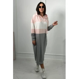 model 18856930 šaty s kapucí pudrově růžová + ecru + šedá - K-Fashion
