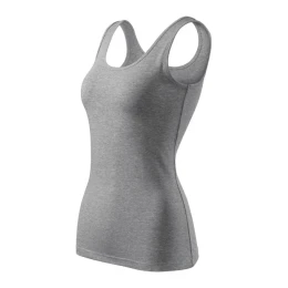 elastický materiál na udržanie tvarovej stability priliehavý strih s bočnými švami hlbší okrúhly výstrih výstrih a prieramky podšité vrchným materiálom širšie ramienka
