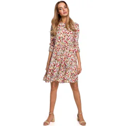 Ľahké viskózové šaty s jemným kvetinovým vzorom. Široký pohodlný strih s voľným vrchom a naberanou sukňou so zvýšeným pásom. Rukávy pod lakťami zúžené v spodnej časti.
