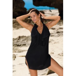 Výstrih so vzdušným volánom je ženský a zaujímavý, látka je elastická, mierne priehľadná (typ "sieťovaného tylu" - veľmi obľúbený a mimoriadne ženský), výstrih na chrbte a spodná časť tuniky je ukončená polkruhom. 80 % polyamid, 20 % elastan.
