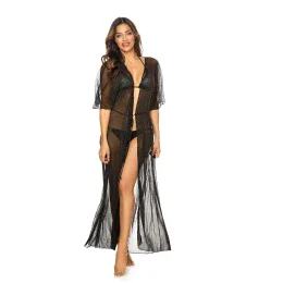 Elegantný čierny dlhý plážový overal zo vzdušnej priesvitnej látky. Vzdušné dámske plážové oblečenie, ktoré vás prekvapí svojim jemným a elegantným materiálom. Ľahký ako páperie, tento prehoz obopne vaše telo a ochráni vás pred slnečnými lúčmi. Sexi, ľahko priesvitný materiál zmyselne zvýrazní krásu ženského tela a pritiahne pohľady. Plážový overal s krátkymi rukávmi, zaväzuje sa vpredu. Rýchloschnúci.