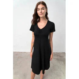 - dĺžka a strih: 105 cm, krátky rukáv, výstrih do V