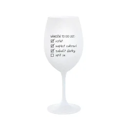 Vinná bílá sklenice s originálním motivem VÁNOČNÍ TODO LIST je krásným a osobitým dárkem, které ale využijete i Vy sami třeba ve chvílích, kdy si budete chtít zpříjemnit náročný den. Tyto originální vinné sklenice jsou totiž nejen pro výjimečné události, ale i pro běžné večery, které si chcete zpříjemnit sklenkou dobrého vína. Jistě proto potěší každého milovníka vína, i toho, kdo si umí svůj život vychutnat plnými doušky. Materiál sklo. Vyrobené s láskou v ČR