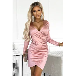 Saténové elegantné šaty s obálkovým výstrihom a dlhými rukávmi. Šaty vo farbe špinavo ružovej. Vyrobené zo saténového mierne elastického materiálu (95% polyester, 5% elastan). Zapínanie na chrbte na krytý zips. Značka Numoco. Poľská výroba.