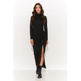 Tieto dlhé šaty z elastického viskózového úpletu sú mimoriadne pohodlné a elegantné. Šaty majú dlhé rukávy a praktický rolák, vďaka čomu sú ideálne na mnohé príležitosti. Ide o maxi šaty so sexi rozparkom, ktorý je navyše zdobený očarujúcou zlatou platničkou, čo im dodáva jemnú extravaganciu. Táto kreácia dokonale zvýrazňuje ženskú postavu a zároveň poskytuje pohodlie vďaka elastickému viskózovému úpletu. K dispozícii sú len v čiernej farbe. Sú spoľahlivou voľbou na elegantné výlety. Klasický strih umožňuje šaty použiť v mnohých zaujímavých štylizáciách. elastan 5 % Viskóza 95 %