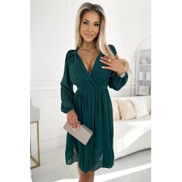 Šifónové midi šaty s dlhými rukávmi a elegantne zakončeným výstrihom. Šaty sú vo fľaškovo zelenej farbe. Celé šaty sú podšité. Značka numoco. Poľská výroba.