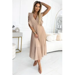 Sukňa z elasťákovej šifónovej látky s výstrihom a volánmi na ramenách. Sukňa je vyrobená v modernej dĺžke 7/8. Má skrytý zips v zadnej časti. Sukňa je béžová. Značka numoco. Vyrobené v Poľsku.