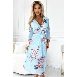Šifónové plisované midi šaty s výstrihom a opaskom. Ružový ružový materiál na modrom podklade. Značka numoco basic. Európska výroba.