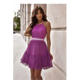Elegantné sieťované šaty s ramienkami a nastaviteľnými viazankami. Šaty sa zapínajú na skrytý zips. Ozdobný pásik na zaväzovanie. Mierne rozšírená spodná časť.