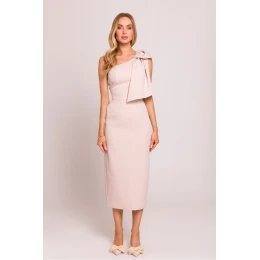Elegantné midi šaty v strihu ceruzkovej sukne, zdôrazňujúce ženskú siluetu. Model zaujme asymetrickým strihom s motívom jedného ramena, zdobeným efektnou mašľou, ktorá dodáva eleganciu a jedinečný charakter. Vysoký rozparok na chrbte jemne odhaľuje nohu, čím dodáva kreácii ľahkosť a zmyselnosť. Šaty sa na bokoch zapínajú na skrytý zips, čo zaručuje ideálne prispôsobenie. Čiastočná podšívka zaručuje pohodlie počas nosenia. Navrhnuté a ušité v Poľsku s dôrazom na každý detail.