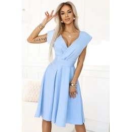 Objavte neprekonateľnú eleganciu v modrých šatách v strednej dĺžke! Táto ženská a štýlová kreácia očarí skladaným výstrihom, ktorý jemne zvýrazňuje postavu, a širokým opaskom, ktorý zvýrazňuje pás. Vzdušná, rozšírená spodná časť dodáva ľahkosť a dokonale sedí pri pohybe. Perfektne sa hodí na svadby, večierky a elegantné podujatia. Cíťte sa krásne a sebaisto v každej situácii!