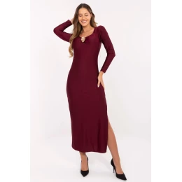 Elegantní šaty s olověným střihem, které okouzlují smyslným a zároveň elegantním charakterem. Vyrobené z viskózy s příměsí polyesteru, krásně se přizpůsobují postavě, zdůrazňujíce ženské tvary. Hladký materiál dodává celku eleganci a midi délka dělá kreaci velmi stylovou. Model se vyznačuje hlubokým rozparkem na levé straně až po stehno, který přidává odvážný akcent a zdůrazňuje nohy. Vsazené košíčky s vycpávkami zajišťují dokonalé přizpůsobení a pohodlí nošení. Výstřih do podkovy zdobený kovovou aplikací a jemným zvrásněním jemně exponuje poprsí a dodává kreaci elegantní dokončení. Šaty nemají zapínání, díky čemuž jsou snadné na oblékání a pohodlné na nošení. To je ideální volba na společenské události a výjimečné večírky, kdy chcete vypadat efektně a s elegancí.