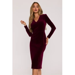 Klasické a smyslné středně dlouhé sametové šaty, které spojují eleganci s nadčasovou jednoduchostí. Vyrobena z měkkého, příjemného na dotek sametového úpletu, krásně odráží světlo, vytváří subtilní, luxusní lesk. Model okouzluje hlubokým výstřihem do srdce, který zdůrazňuje ženskou siluetu a dodává celku eleganci. Dlouhé, přímé rukávy přinášejí rovnováhu do střihu, dodávají mu elegantní a vyvážený charakter. Šaty mají přiléhavý olivový střih, s jasně vyznačenou talií a délkou za koleno, co opticky zúží postavu a bude skvěle ladit jak do večerních stylizací, tak na speciální příležitosti. Model nemá kapsy ani podšívku, díky čemuž si zachovává lehkost a pružnost. Skrytý zip vzadu usnadňuje oblékání a zajišťuje dokonalé přizpůsobení tělu. Šaty navrženy a ušity v Polsku s pečlivostí o každý detail, ideální volba pro ženy, které oceňují klasickou eleganci a pohodlí nošení.