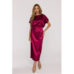 Jemný a elegantní midi šaty ze saténu, které okouzlí jednoduchostí tvaru a šlechetným leskem látky. Vyrobené z hladkého, plného saténu, jemně obklopují siluetu a krásně odrážejí světlo, vytvářejíce efekt luxusní lehkosti. Model má výstřih typu lodník, který jemně zdůrazňuje linii ramen a krku, a krátké, volné rukávy dodávají vzdušnosti a pohodlí. Horní část šatů má volnější střih, díky čemuž ji lze jemně pustit z sukně, vytvářejíce volnou, přirozenou linii. Spodní část se váže jako pareo kolem pasu, což umožňuje přizpůsobení střihu siluetě a zdůraznění pasu stylovým, ženským způsobem. Šaty nemají podšívku, což zajišťuje, že zůstávají lehké, příjemné na dotek a ideální na teplejší dny. Model byl navržen a vyroben v Polsku s nejvyšší pečlivostí o detail. Jedná se o elegantní saténové midi šaty, které spojují pohodlí, minimalismus a ženský půvab ideální na večírky, schůzky a letní příleži