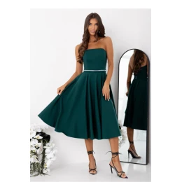 Tieto elegantné šaty bez ramienok sú dizajnom, ktorý spája klasický strih s efektnými detailmi. Model sa zapína na skrytý zips umiestnený na ľavej strane, čo zaručuje pohodlné obliekanie a estetické prevedenie. Pás je zvýraznený ozdobným flitrovým opaskom, ktorý celku dodáva pôvab a jedinečný charakter. Rozšírená spodná časť sa pri pohybe krásne prehýba, čím dodáva siluete ľahkosť a dievčenský šarm. Na chrbte je praktické šnurovanie, ktoré umožňuje prispôsobiť strih. Okrem toho sú v šatách vsadené ramienka, ktoré umožňujú pripevniť si ramienka podľa vlastných potrieb (ramienka nie sú súčasťou balenia). Ide o ideálnu voľbu na slávnostné udalosti, večierky a výnimočné príležitosti.