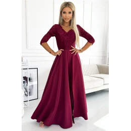 Elegantné dlhé maxi šaty s čipkovaným výstrihom. Rozparky na sukni spolu s čipkovaným topom vytvárajú nevšedný výtvor vo vínovej farbe. Vyrobené v Poľsku. Značka numoco.