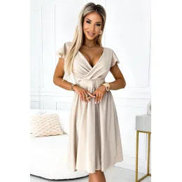 Rozšírené šaty s obálkovým výstrihom a krátkymi rukávmi. Sú vyrobené z mierne elastickej tkaniny béžovej farby. Značka numoco. Poľský výrobok.