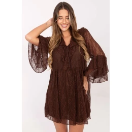 Tieto nápadné čipkované šaty s rozšíreným strihom sú dizajnom, ktorý zvýrazňuje ženskosť a dodáva šarm každému outfitu. Sú vyrobené z jemnej čipky s priehľadným vzorom s prídavkom nylonu a elastanu, krásne sedia na postave a zaručujú pohodlie pri nosení. Model má podšívku, ktorá zaručuje pohodlie a elegantný vzhľad. Výstrih do V s jemným zaväzovaním jemne zvýrazňuje krk a volánik na prednej strane a 3/4 rukávy ukončené volánmi dodávajú šatám romantický, štýlový charakter. Šaty v dĺžke mini sú ideálne na večierky, recepcie, Silvester alebo iné spoločenské udalosti, kde vytvoria oslnivý a elegantný outfit.