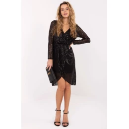 Elegantní šaty ve šatovém střihu, jejichž spodek je navržený také ve formě obálky, zdůrazňující ženskou siluetu a dodávající lehkost a efektní charakter. Model se skvěle hodí na večírek a na formální události. Šaty jsou vyrobeny z polyesteru a elastanu, díky čemuž se dobře přizpůsobují postavě a zajistí pohodlí při nošení. Jejich povrch je celý pokrytý třpytivými flitry, které krásně odrážejí světlo a přitahují pozornost. Dlouhý rukáv a efektní šatový výstřih dodávají šatům eleganci a smyslný výraz. Model má délku před kolena a jeho pohodlí zvyšuje skutečnost, že nemá zapínání, což usnadňuje oblékání. Navíc je vybaven podšívkou, která zvyšuje pohodlí nošení a zajišťuje ideální uspořádání materiálu. Šaty vytvořené pro ženy, které chtějí zářit leskem a elegancí během výjimečných událostí.