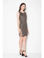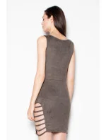 Šaty zo semišovej tkaniny. Šaty majú široké ramienka a vyznačujú sa efektnými výrezmi na stehnách. Ideálne pre zvláštne príležitosti.
