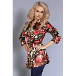 Saténový komplet sa skladá z dlhšieho kabátiku a dlhých nohavíc. Kabátik je na zaväzovanie v páse stuhou. Pohodlné nohavičky sú v páse na gumu.