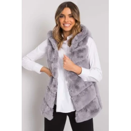 Sivá dámska vesta s kapucňou. Vesta sa zapína na háčiky, je celá podšitá.