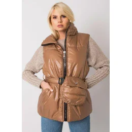 Hnedá vesta s perovou podšívkou a zipsom. Vesta s vreckami, vrátane opasku.