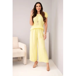 Objevte jedinečný komplet, který spojuje pohodlí a eleganci a vytváří dokonalý outfit pro každou příležitost. Vyrobený z lehké a prodyšné viskózy, poskytuje maximální komfort při nošení a zároveň vypadá velmi stylově. Plisovaná halenka s volným střihem jemně podtrhuje siluetu a dodává jí lehkost a moderní vzhled. Široké kalhoty dokonale ladí s halenkou a zajišťují volnost pohybu i elegantní vzhled. Celý komplet doplňuje ozdobný náhrdelník, který přidává jedinečný stylový prvek a eliminuje potřebu dalších doplňků. Tento set je ideální jak pro formální setkání, tak i pro každodenní nošení, kdy chcete vypadat elegantně, ale zároveň se cítit pohodlně. Vyberte si komplet z viskózy a užívejte si lehkost i nadčasový styl. Velikost je univerzální a vhodná pro ženy nosící velikosti S, M nebo L.