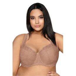 Nádherná veľká podprsenka Carmela. K dispozícii vo veľkých veľkostiach. Krásne zvýrazňuje dekolt, dokonale zhromažďuje prsia. Vďaka širokému ozdobnému ramienku umožňuje zakryť asymetriu pŕs. Košíčky sú vyrobené z mäkkej čipky cappuccino, ktorá sexi obopína prsia a jemne sa dvíha pozdĺž ramienka. Štýlové košíčky vsadené do čipkovej tkaniny a čipkovaný chrbát, ktorý bol vystužený elastickou sieťovinou. Nastaviteľné, neodnímateľné ramienka. Dvojrýchlostné a trojcestné nastaviteľné zapínanie.