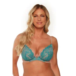 Podprsenka s plne vystuženými košíčkami, celé košíčky vo farbe MOKKA sú pokryté tyrkysovou čipkou, bez bočných veľrybích kostíc.