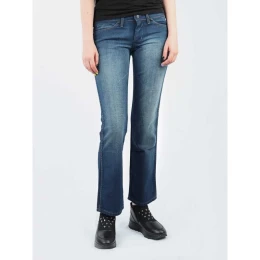 Dámske džínsové nohavice s nízkym vzrastom a rozšírenými nohavicami. Zapínanie na zips a charakteristický čierny gombík. Výrazná kožená nášivka s logom na zadnom vrecku.