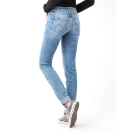 Dámské džíny se zúženými nohavicemi, malými kapsami vpředu a vzadu a koženou vsadkou s logem Wrangler na zadním pásu.