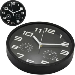 ZEGAR ŚCIENNY 25CM Z TERMOMETREM CZARNY to nowoczesny zegar z wyraźnym wyświetlaczem czasu, temperatury i stopnia wilgotności powietrza. Ma prosty, minimalistyczny wygląd i jest idealny do biur, nowoczesnych wnętrz a nawet miejsc pracy.