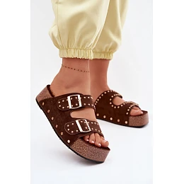 Dámske papuče z ekologického semišu sú módnou a pohodlnou ponukou na teplé dni. Mäkký materiál im dodáva štýlový vzhľad a zároveň zabezpečuje pohodlie pri každodennom nosení. Model je umiestnený na ľahkej korkovej platforme, ktorá dobre tlmí kroky a dodáva topánke moderný charakter. Zlaté pracky a ozdobné nity priťahujú pozornosť a dodávajú celku efektný, módny akcent. Vnútro topánky dopĺňa jemne profilovaná stielka, ktorá zvyšuje pohodlie a podporuje prirodzenú polohu chodidla. Je ideálnou voľbou pre ženy, ktoré ocenia kombináciu pohodlia a osobitého štýlu.