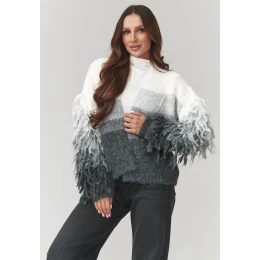 Tento elegantný dámsky sveter v sivej a béžovej farbe v sebe spája pohodlie a výnimočný dizajn. Je vyrobený z mäkkej priadze príjemnej na dotyk a poskytuje teplo a pohodlie počas chladnejších dní. Voľný strih jednej veľkosti sa dokonale prispôsobí postave, čím zaručuje voľnosť pohybu a módny vzhľad. Rukávy zdobené efektnými mihalnicami dodávajú svetru originálny charakter a jemný prechod farieb od svetlejších po tmavšie vytvára elegantný, moderný ombre efekt. Ideálny je k džínsom, legínam alebo sukniam, je ideálny na každodenné nosenie alebo na stretnutie s priateľmi.
