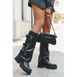 Stylowe kozaki damskie wykonane z eko skóry to idealny wybór dla kobiet ceniących modny wygląd i wygodę. Osadzone na platformie z płaskim obcasem gwarantują stabilność oraz komfort noszenia przez cały dzień. Model wyróżnia się efektowną, wywiniętą cholewką, która nadaje całości oryginalnego charakteru. Trzy srebrne klamry z paskami to detal przyciągający uwagę i dodający wyrazistego, nowoczesnego stylu. Kozaki zapinane są na zamek, co ułatwia ich zakładanie i zdejmowanie. Wnętrze zostało ocieplone, dzięki czemu buty doskonale sprawdzą się w chłodniejsze dni. To model, który świetnie prezentuje się zarówno w casualowych stylizacjach z jeansami, jak i w zestawieniu z sukienką czy spódnicą, dodając każdemu outfitowi nuty charakteru.