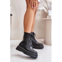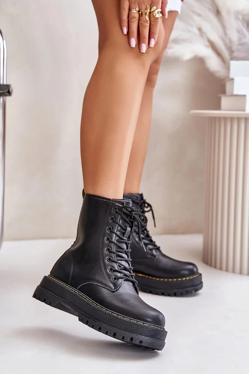 Dámske členkové čižmy vyrobené z ekokože. Majú zips na boku zvršku a šnurovanie. Postavené sú na platforme. Vo vnútri majú zateplenie z deky na topánky. Okrem toho je päta vystužená. Tieto čižmy by nemali chýbať vo vašej skrini! Pri výbere veľkosti sa riaďte tabuľkou veľkostí.