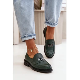 Zazoo 20174 Skórzane Eleganckie Półbuty Damskie Na Płaskim Obcasie Ciemnozielone