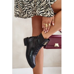 Damskie botki wykonane z wysokogatunkowej skóry naturalnej, które łączą elegancję i funkcjonalność. Model zapinany na zamek z dodatkowym sznurowaniem, co zapewnia idealne dopasowanie do stopy. Na języku umieszczono złoty detal, dodający subtelnego blasku i wyjątkowego charakteru. Przy wyborze rozmiaru prosimy sugerować się tabelą rozmiarów.
