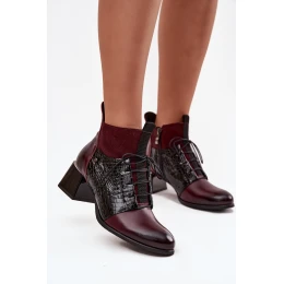 Zazoo 60503 Skórzane Botki Na Obcasie Ocieplane Bordowe