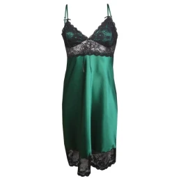 Elegantní saténová noční košilka s černou krajkou. V neuvěřitelně módní smaragdové barvě. Košíčky mají měkkou konstrukci, tenká nastavitelná ramínka a mini mašličky. Horní díl je mírně vypasovaný a elastický, spodní díl je volný a vzdušný s krásným krajkovým lemem kolem stehen. Nejnovější kolekce od společnosti DKaren. Složení: 100% polyester.