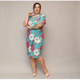 Šaty mají přeložený obálkový výstřih. Model je v pase odstřižený. Spodní část šatů je přeložená, obálková. Model má délku ke kolenům.