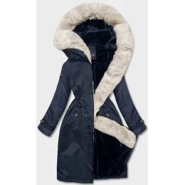 Tmavomodrá dámska zimná bunda s machovou kožušinovou podšívkou (B538-3046)
