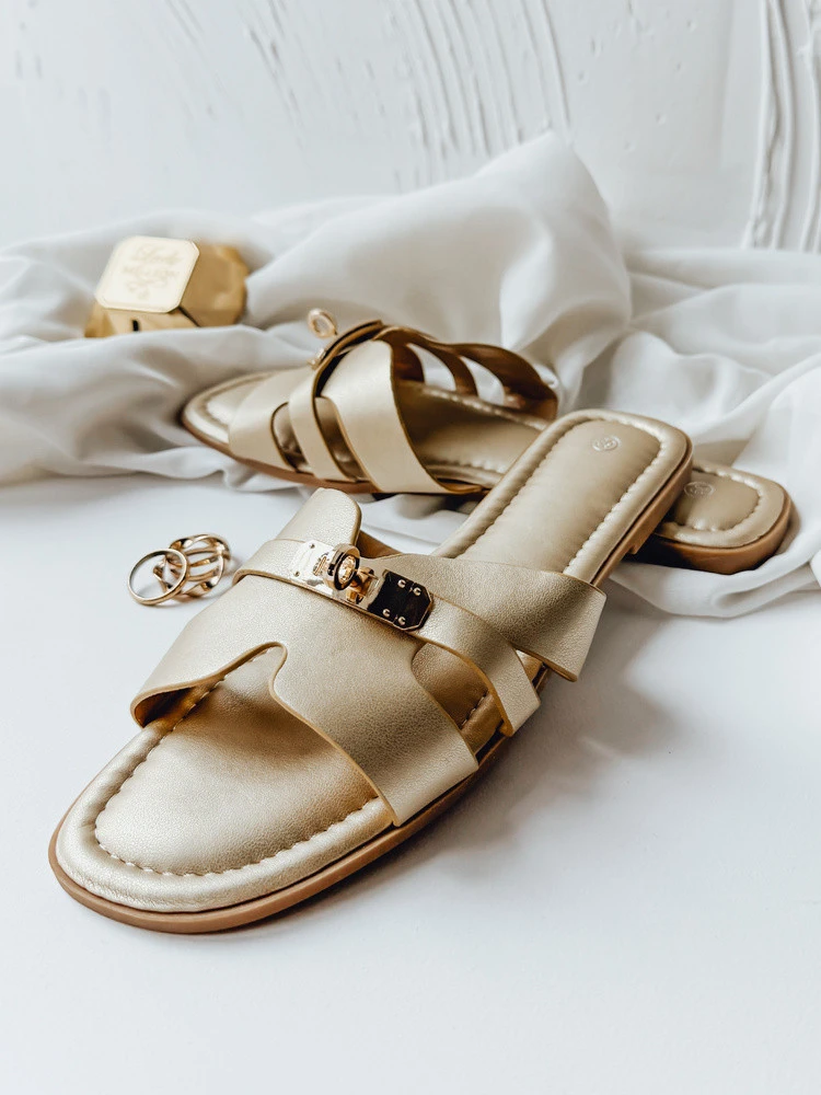 Letnie klapki damskie z miękkiej, ekologicznej skóry i dekoracyjną sprzączką w kolorze złota to świetna propozycja na ciepłe dni. Komfortowa, pikowana wkładka zapewnia wygodę, a nowoczesny fason wpisuje się w aktualne trendy. Idealne do letnich sukienek i spodni z wysokim stanem.