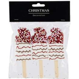 Ak chcete vianočnú výzdobu obohatiť o trochu zábavy a sladkosti, siahnite po sade závesných ozdôb v tvare zmrzliny - 3 kusy. Trblietavé, lesklé a farebnými detailmi zdobené prívesky vyzerajú ako sladké lízanky a sú ideálne na vianočný stromček, girlandy, vence alebo ako súčasť zimných aranžmánov.